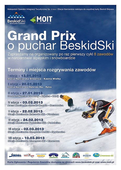 Zapraszamy wszystkich miłośników białego szaleństwa na organizowany po raz pierwszy cykl ośmiu zawodów w narciarskie alpejskim i snowboardzie. To doskonała okazja do sprawdzenia swoich umiejętności. Grand Prix o Puchar BeskiSki to cykl ośmiu edycji zawodów rozgrywanych w ośmiu ośrodkach : Ryterski Raj w Rytrze, KokuszkaSki w Piwnicznej Zdroju, Śnieżnica w Kasinie Wielkiej, LimanowaSki w Limanowej, Kompleks Beskid w Spytkowicach, PodstoliceSki koło Krakowa oraz Azoty w Krynicy Zdroju i Jaworkach – Homole koło Szczawnicy należących do wspólnej karty Beskid Skipass.